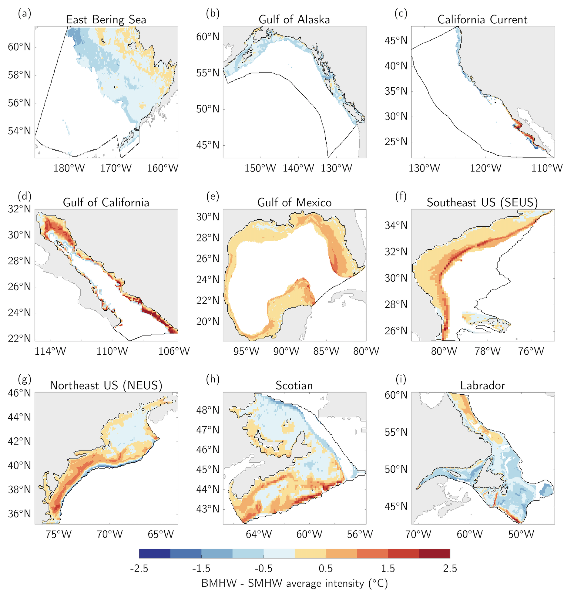 Figure 1 Average BMHW intensity in nine Large Marine Ecosystems (LMEs) around North America. Results shown for ocean grid cells with bottom depths shallower than 400m.